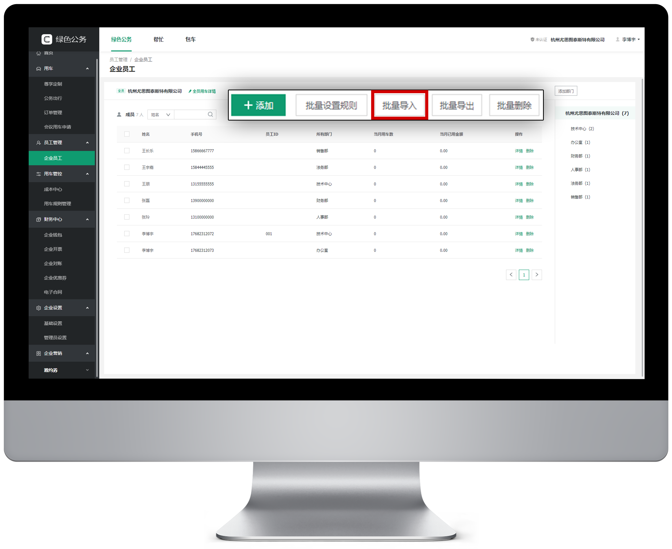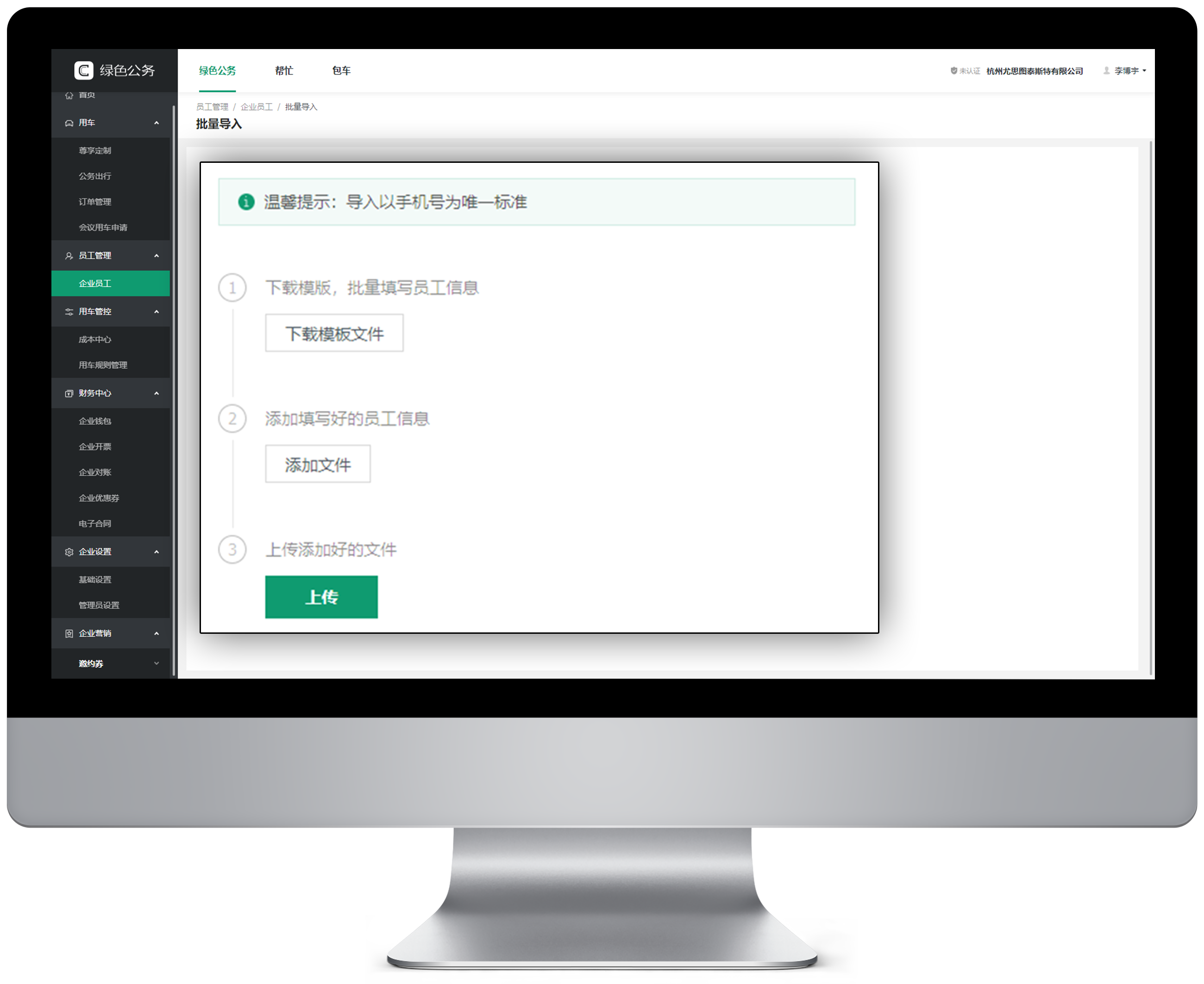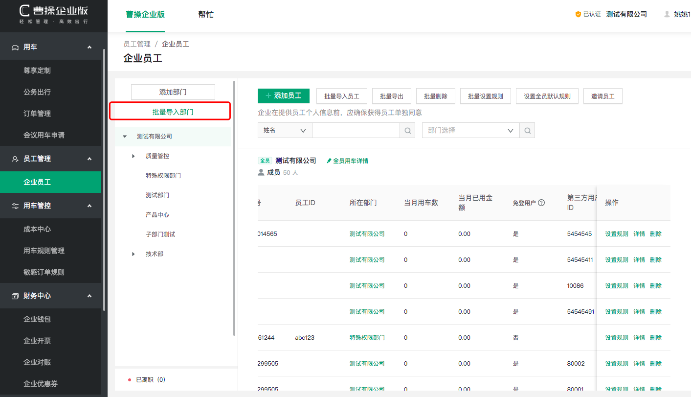 批量新增员工需要将员工信息填写至excel模版中,一次可导入多名员工。 支持员工的部门、用车规则对应导入 设置入口:登陆曹操企业版用车管理后台,点击“企业员工”-“批量导入”-“下载模板文件”,根据表格格式要求填写员工信息后,点击“添加文件”选择填写完毕的员工信息表,点击“上传”完成批量上传。 |