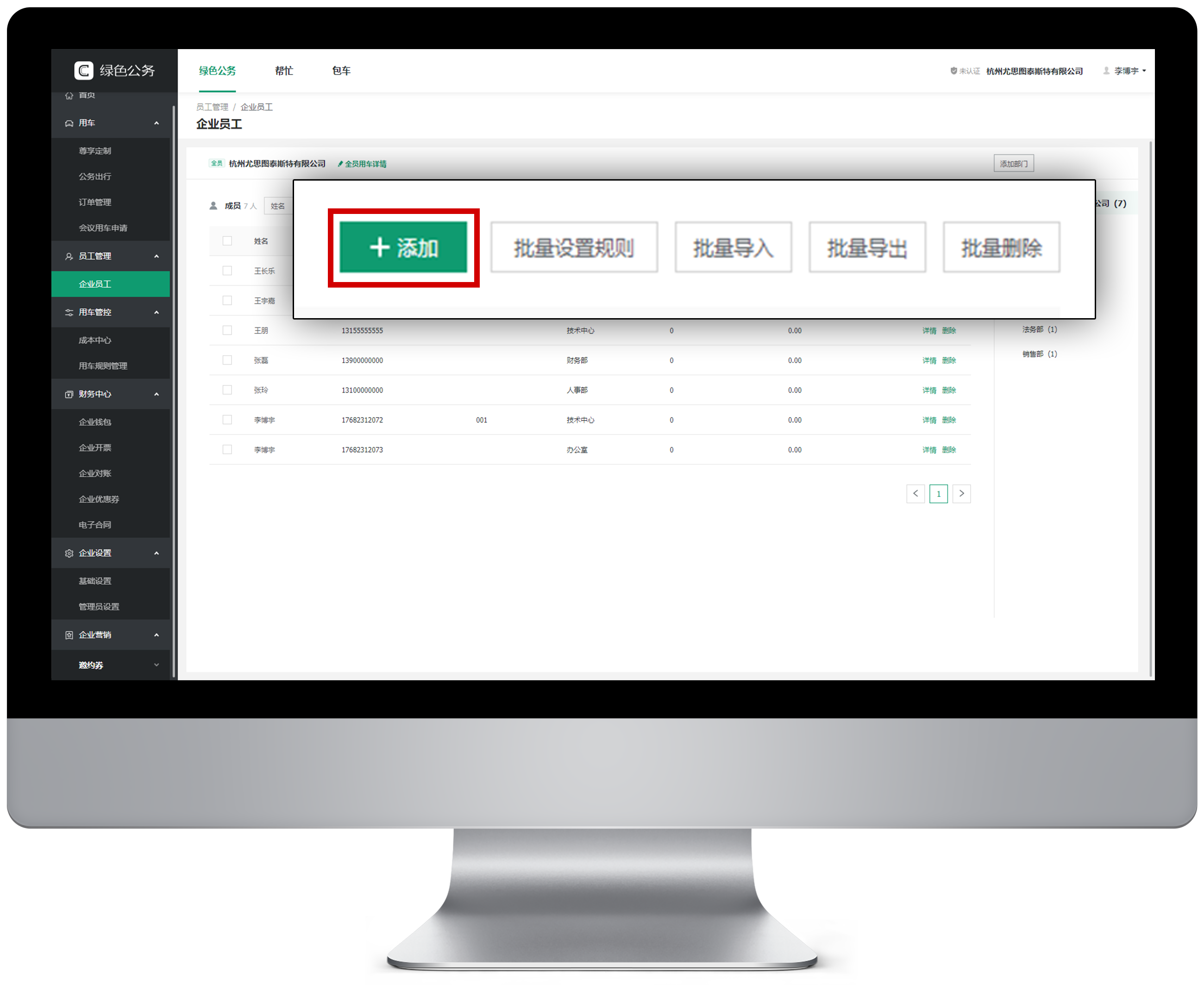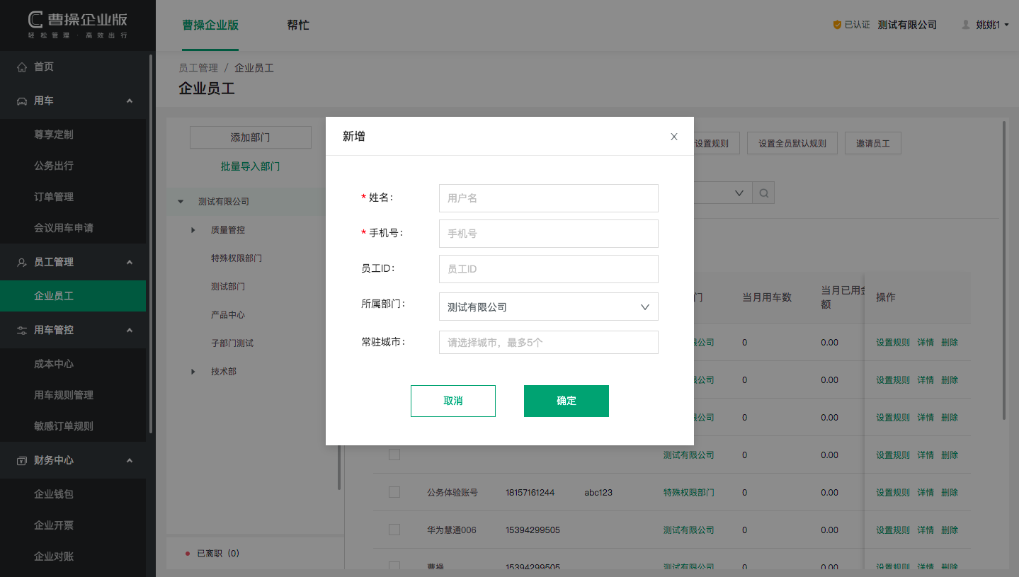 设置入口:登陆曹操企业版用车管理后台,点击“企业员工”-“添加”,填写员工信息。 填写“姓名”、“手机号”、“员工ID”和选择员工“所属部门”"常驻城市",填写完成后点击确定完成添加。 |